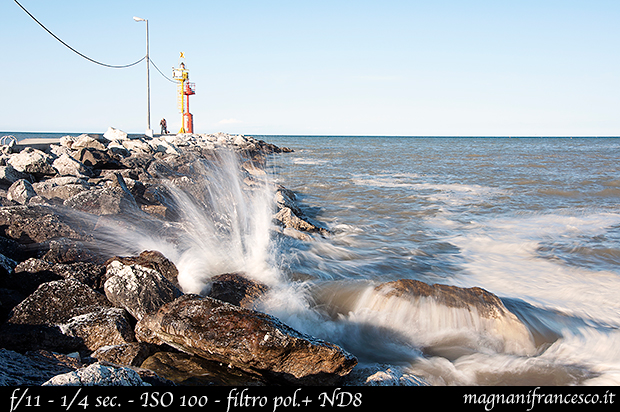 - Filtri (opzionale) può esservi utile un polarizzatore per eliminare i riflessi e rendere un po’ più saturi i colori oppure un altro filtro spesso utilizzato è quello a densità neutra, comunemente siglato “ND” e seguito da un numero che indica il grado di opacità della lente. Più sarà elevato il numero e più potrete aumentare il tempo di esposizione, fondamentale nelle giornate di sole.