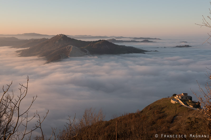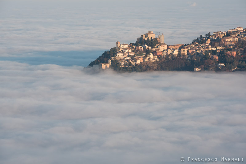 La nebbia sembrava non volesse abbandonarmi, ma poi, negli ultimi cinquecento metri che mi dividevano dal punto più alto, vidi prima un po’ di chiarore, poi, un bagliore improvviso e finalmente, il sole. Parcheggiai la macchina e mi diressi verso il punto più alto a piedi, una volta arrivato, la natura aveva messo in scena uno degli spettacoli più belli: una fitta coltre di nebbia creava l’illusione ottica del mare, un vero paradiso in terra, veniva voglia di tuffarsi. Si potevano ammirare tutti i borghi dell’entroterra che, illuminati dal sole, emergevano dal mare di nuvole.
