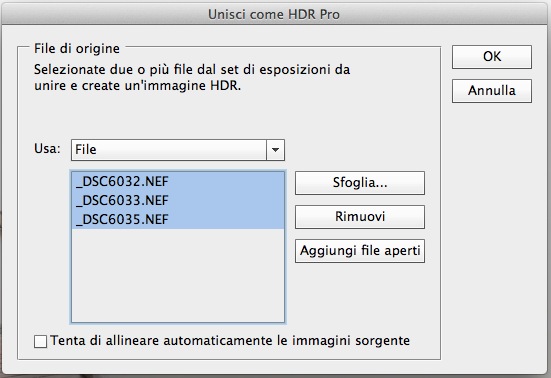- In Photoshop andate su file, automatizza, unisci come HDR Pro, selezionate le foto con esposizioni diverse cliccando sul bottone aggiungi file aperti e dopo di che premete ok. L’opzione “tenta di allineare automaticamente le immagini sorgente” non deve essere spuntato.
