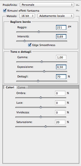 - Come metodo scegliete il valore 16 bit, a fianco lasciate invariato il campo “adattamento locale” e spuntate l’opzione rimuovi effetti fantasma con il quale vedrete già un evidente miglioramento. Sotto trovate una serie regolazioni che potete modificare fino ad ottenere l’effetto desiderato. Ricordate di non esagerare, la foto deve rispecchiare la realtà, personalmente non adoro gli HDR troppo marcati che appaiono come dipinti.